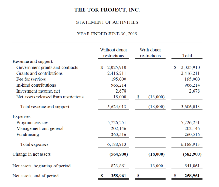 Wer steht hinter dem TOR-Projekt und woher kommen die finanziellen Mittel für Wartung und Weiterentwicklung der Technologie? Auskunft darüber gibt der Finanzbericht der Organisation „THE TOR PROJECT, INC.“. Im Finanzjahr 2019 (d.h. Juni 2018 bis Juni 2019) hatte die Organisation ein Budget von insgesamt $ 5,6 Mio.
